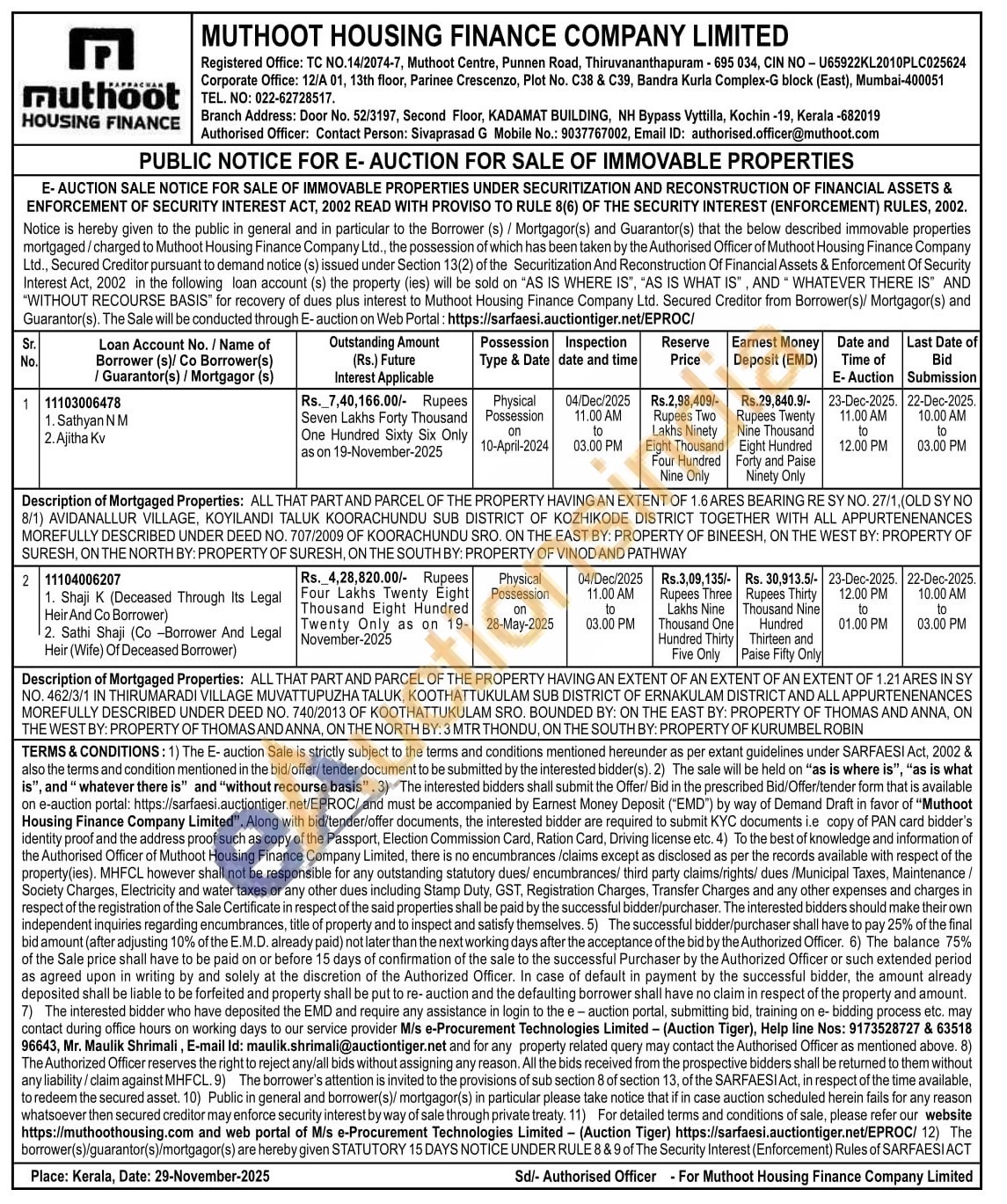 Contact Authorised Officer: Contact Person: Sivaprasad G Mobile No.: 9037767002, Email ID: authorised.officer@muthoot.com