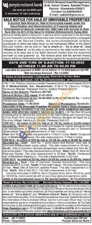 All The Part Of Land Admeasuring To 166 2/9 SQ. YDS IN R.S.NO.522/2 Along with Ground Floor & First Floor RCC building Constructed Thereon Situated At Ward No 2. Palukuru Village, Kandukuru Mandal, Prakasam Dist A.P. ITEM NOI An extent of 250 Sq. feet or 27 7/9 Sq yards or 23.333 meters Bounded by: East:12 feet 3 inches width joint bazaar for ingress and egress. The side measurement is 14 feet 6 inches, South: Compound wall of Somineni Malakondaiah. This side measurement is 17 feet 3 inches West: Item No.2. This side measurement is 14 feet 6 inches. North: Compound wall of Maddineni Raghavulu. This side measurement is 17 Feet 3 inches. ITEM NO II: An extent of 1022 Sq. feet or 113 5/9 So. varda or 95.386 Sq. metera Bounded by: East: Item No. 1 some extent and Kitchen room wall of Somineni Malakondaian some extent. This side measurement is 38 feet, South Site of Somineni Venkata Narasimham some extent and Item No.3 site some extent. This side measurement is 28 feet, West: Site OF Somineni Rajendra Prasad. This side measurement is 35 feet, North: Compound wall of Maddineni Raghavulu. This side measurement is 28 Feet ITEM NO : An extent of 224 Sq, feet or 24 8/9 Sq. vards or 20.906 Sq. meters Bounded by: East: Site of Somineni Venkata Narasimham This side measurement is 12 Feet South: 9 Feet width bazaar. This side measurement is 20 feet, West: Site of Somineni rajendra Prasad. This side measurement is 8 Feef North: Site of Item No.2. This side measurement is 28 Feat