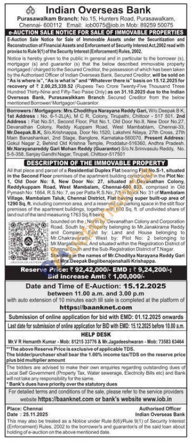All that piece and parcel of a Residential Duplex Flat bearing Flat No.S-1, situated in the Second Floor premises of the apartment building constructed in the Plot No: 1. Old Door No: 8, New Door No: 27, situated at Devanathan Colony, Reddykuppam Road, West Mambalam, Chennai-600 033, comprised in Old Pymash No: 1664, R.S. No. 7, as per Patta R.S.No: 7/5 in Block No: 31 of Mambalam Village, Mambalam Taluk, Chennai District, Flat having super built-up area of 1290 Sq. ft. including common area, and a reserved car parking space in the stilt floor premises of the apartment buildings, together with 600 Sq. ft. of undivided share of land out of the land measuring 1763 Sq.ft being bounded on the North by: Devanathan Colony and Corporation Road, South by Property belonging to Mr.Janakirama Reddy and Company, East by Land and House belonging to Mr. Chakravarathi, West by: Plot No: 2 belonging to Mr. Margabandhu, And situated within the Registration District of Chennai South and the Sub-Registration District of T. Nagar, Standing in the names of Mr. Choditya Narayana Reddy Gari and Mrs. Deepak Beglibenajenahalli Krishappa.