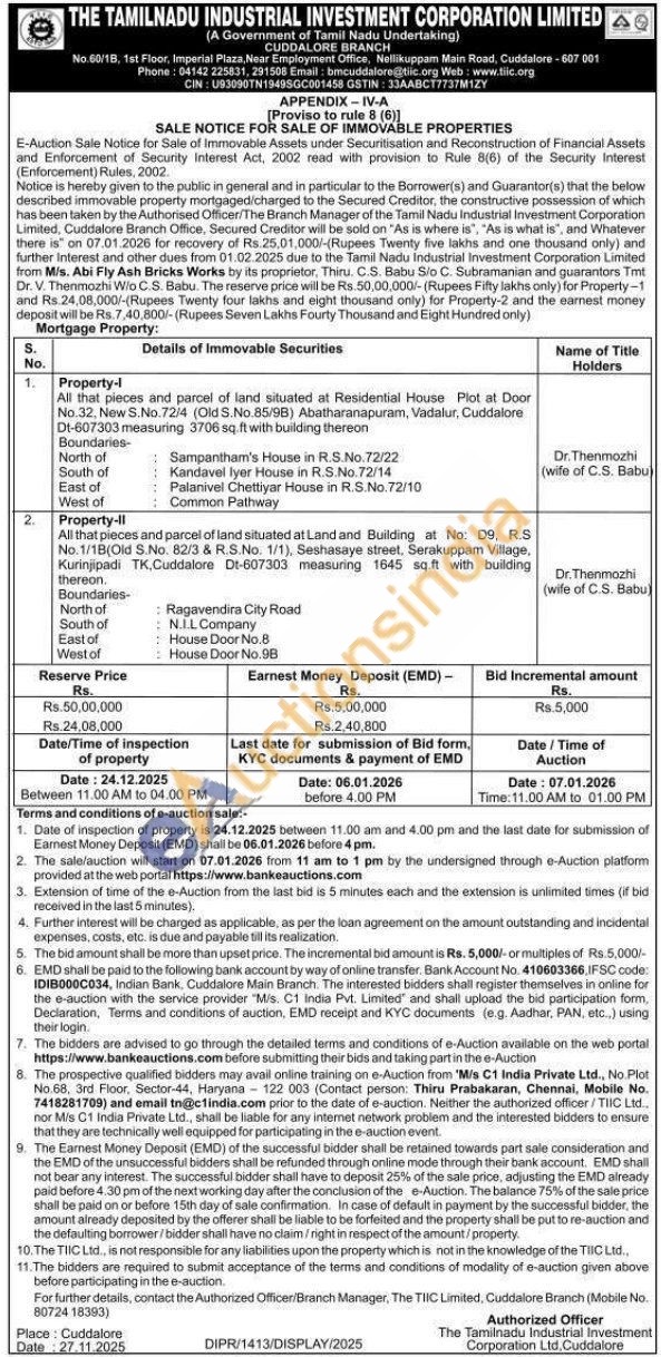 All that pieces and parcel of land situated at Land and Building at No: D9, R.S No.1/1B(Old S.No. 82/3 & R.S.No. 1/1), Seshasaye street, Serakuppam Village, Kurinjipadi TK, Cuddalore Dt-607303 measuring 1645 sq.ft with building thereon.