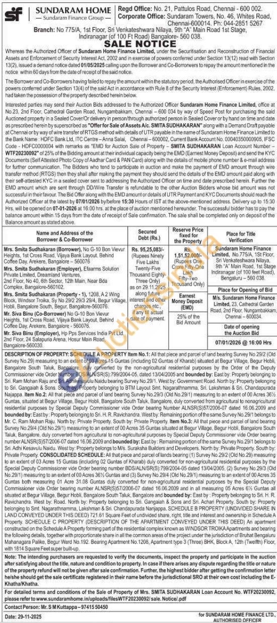DESCRIPTION OF PROPERTY: SCHEDULE A PROPERTY Item No.1: All that piece and parcel of land bearing Survey No. 29/2 (Old Survey No.29) measuring to an extent of 03 Acres 15 Guntas (including 02 Guntas of Kharab) situated at Begur Village, Begur Hobli, Bangalore South Taluk, Bangalore, duly converted by the non-agricultural residential purposes by the Order of the Deputy Commissioner vide Order Number BDS/ALN/SR(S):799/2004-05, dated 13/04/2005 and bounded by: East by: Property belonging to Sri. Ram Mohan Raju and Sri. Adhikesavulu Naidu bearing Survey No.29/1. West by: Government Road. North by: Property belonging to Sri. Gangalah & Sons. South by: Property belonging to BTM Layout Smt. Nagarathnamma, Sri. Lakshman & Sri. Chandapurada Najappa. Item No.2: All that piece and parcel of land bearing Survey No.29/3 (Old No.29/1) measuring to an extent of 00 Acres 36% Guntas, situated at Begur Village, Begur Hobli, Bangalore South Taluk, Bangalore, duly converted from agricultural to nonagricultural residential purposes by Special Deputy Commissioner vide Order bearing Number ALNSR(S)57/2006-07 dated 16.06.2009 and bounded by: Eastby: Property belonging to Sri. H. R. Ravichandra. Westby: Remaining portion of the same Survey No. 29/1 belongs to Mr. C. Ram Mohan Raju. North by: Private Property. South by: Private Property. Item No.3: All that piece and parcel of land bearing Survey No. 29/4 (Old No.29/1) measuring to an extent of 00 Acres 35 Guntas situated at Begur Village, Begur Hobli, Bangalore South Taluk, Bangalore, duly converted from agricultural to non-agricultural purposes by Special Deputy Commissioner vide Order bearing number ALNSR(S)57/2006-07 dated 16.06.2009 and bounded by: East by: Remaining portion of the same Survey No.29/1 belongs to Sri. Adhi Kesavulu Naidu. West by: Property belongs to Mis. Suraksha Builders and Developers. North by: Private Property. South by: Private Property, CONSOLIDATED SCHEDULE: All that piece and parcel of lands bearing (1) Survey No. 29/2 (Old No.29) measuring to an extent of 03 Acres 15 Guntas (including 02 Guntas of Kharab) duly converted for non-agricultural residential purposes by the Special Deputy Commissioner vide Order bearing number BDS/ALN/SR(S):799/2004-05 dated 13/04/2005, (2) Survey No.29/3 (Old No.29/1) measuring to an extent of 00 Acres 36% Guntas and (3) Survey No.29/4 (Old No.29/1) measuring to an extent of 00 Acres 35 Guntas both measuring 01 Acre 31.08 Guntas duly converted for non-agricultural residential purposes by the Special Deputy Commissioner vide Order bearing number ALNSR(S)57/2006-07 dated 16.06.2009 and in all measuring 05 Acres 6% Guntas all situated at Begur Village, Begur Hobli, Bangalore South Taluk, Bangalore and bounded by: East by: Property belonging to Sri. H. R. Ravichandra. West by: Road. North by: Property belonging to Sri. Gangalah & Sons and Sri. Achari Property. South by: Property belonging to Smt. Nagarathnamma, Lakshman & Sri. Chandapurada Nanjappa, SCHEDULE B PROPERTY (UNDIVIDED SHARE IN LAND CONVEYED UNDER THIS DEED) 721 61 Square Feet of undivided share, right, title and interest and ownership in Schedule A Property, SCHEDULE C PROPERTY (DESCRIPTION OF THE APARTMENT CONVEYED UNDER THIS DEED) An apartment constructed on the Schedule A Property forming part of the residential complex known as WINDSOR TROIKA Apartments and bearing the following details, together with proportionate share in all the common areas of the project under the jurisdiction of Bruhat Bengaluru Mahanagara Palike, Begur Ward No. 192. Bearing Apartment No. 1208, Apartment type 3 (Three) BHK, Block A, 12th (Twelfth) Floor, with 1814 Square Feet super built-up