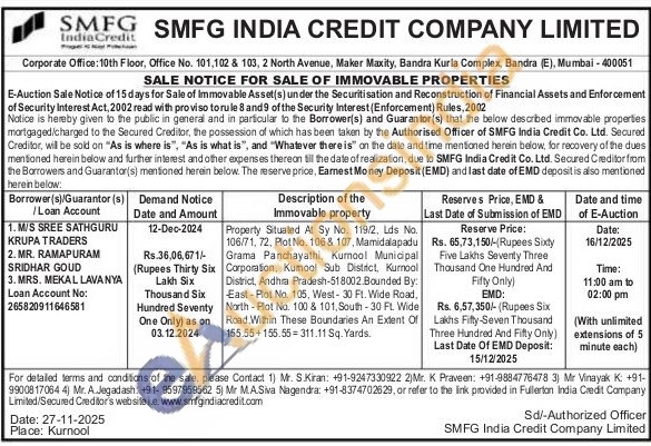 Property Situated At Sy No. 119/2, Lds. No. 106/71, 72, Plot No. 106 & 107, Mamidalapadu Grama Panchayathi, Kurnool Municipal Corporation, Kumool Sub District, Kurnool District, Andhra Pradesh-518002.Bounded By: East-Plot No. 105, West-30 Ft. Wide Road, North-Plat No. 100 & 101, South-30 FL. Wide Road, Within These Boundaries An Extent Of 155.55+155.55-311.11 Sq. Yards