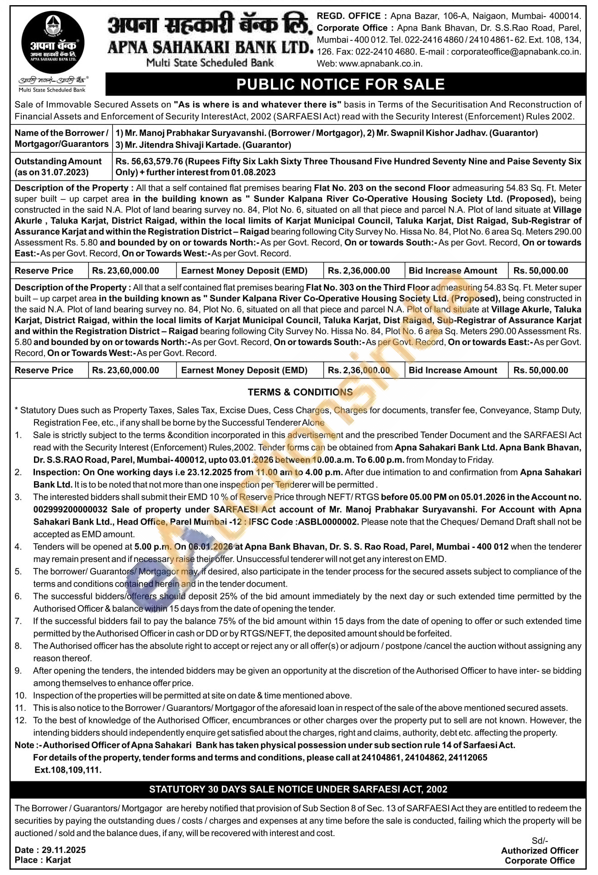 All that a self contained flat premises bearing Flat No. 203 on the second Floor admeasuring 54.83 Sq. Ft. Meter super built up carpet area in the building known as " Sunder Kalpana River Co-Operative Housing Society Ltd. (Proposed), being constructed in the said N.A. Plot of land bearing survey no. 84, Plot No. 6, situated on all that piece and parcel N.A. Plot of land situate at Village Akurie, Taluka Karjat, District Raigad, within the local limits of Karjat Municipal Council, Taluka Karjat, Dist Raigad, Sub-Registrar of Assurance Karjat and within the Registration District-Raigad bearing following City Survey No. Hissa No. 84, Plot No. 6 area Sq. Meters 290.00 Assessment Rs. 5.80 and bounded by on or towards North:-As per Govt. Record, On or towards South:-As per Govt. Record. On or towards East:-As per Govt. Record, On or Towards West:-As per Govt. Record