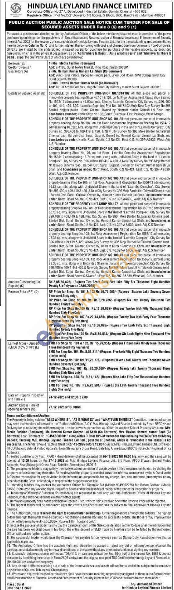 SCHEDULE OF THE PROPERTY UNIT-SHOP NO.101&102 All that piece and parcel of immovable property bearing/Shop No. 101 & 102, on 1st Floor Assessment Registration Bearing No. 1562/12 admeasuring 45.00sq, mts. Situated Laxmiba Copmlex, City Survey no.:396, 400 to 409, 419, 420, SOC, Laxmiba Copmlex, Plot No. 1018102. Muje New City Survey No.396 Bardoli Nagara palika Surat Gujarat. Dwned by, Hemant Kumar Ganesh Lal Shah and boundaries as under, North: Shop No. 103, South: Staircase, East: Passage, West: Margin.