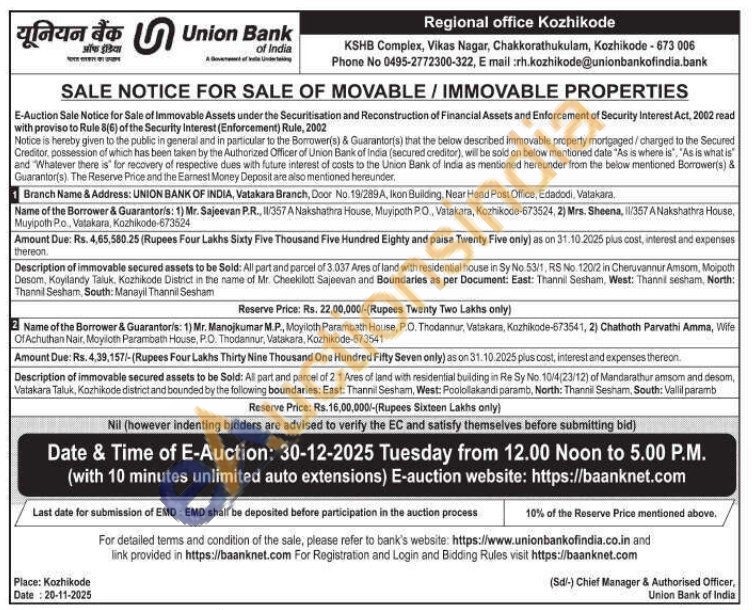 1) All part and parcel of 3.037 Ares of land with residential house in Sy No.53/1, RS No. 120/2 in Cheruvannur Amsom, Moipoth Desom, Koyilandy Taluk, Kozhikode District in the name of Mr. Cheekilott Sajeevan and Boundaries as per Document: East: Thannil Sesham, West: Thanni sesham, North: Thannil Sesham, South: Manayil Thannil Sesham