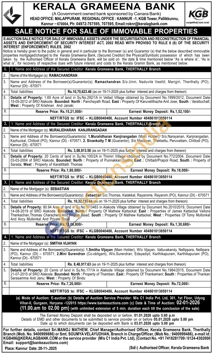 Sri.MANOJ MATHEW Authorised Officer Therthally Branch (Mobile No : 9400999886) / Smt. SOUMYA VELAYUDHAN Branch in Charge/Officer (Mobile No: 9400999486)