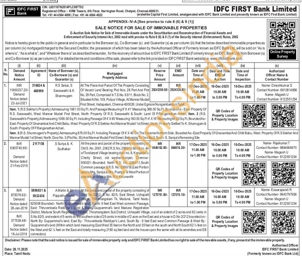All The Piece And Parcel Of The Property Consisting First Street, Vadapalani, Chennai-600026, Under Egmore Nungambakkam Taluk, Of Vacant Land Bearing Plot Nos. 28 Part And Plot.No. 29 Part, Comprised In T.S.No. 63/11, Block No. 2, Situated At No. 109, Puliyur Village, At Mannar Mudali Item. 1 (R.S Sekhar's Property) Admeasuring 1681.00 Sq. Ft And Passage Measuring 9'X 41' Measuring 369.00 Sq.Ft, BoundedAs:- East: Property Of R.S. Saraswathi, West: Mannar Mudali First Street, North: Property Of R.S. Saraswathi & South: Land Of P.Ranganathan Achari, Item. 2 (R.S. Saraswathi's Property) Admeasuring 1069.00 Sq. Ft. Including Passage Of 4' X45' Measuring 180.00 Sq.Ft 4' X 16' Measuring 64.00 Sq. Ft, BoundedAs: East: Property Of Gnanambal And Chitti Babu, West: Property Of R.S Sekhar And Mannar Mudali 1st Street, North: Property Settled To K. Shumugam & South: Property Of P.Ranganathan Achari,Item. 3 (R.S. Shunmugam's Property) Admeasuring 876.00 Sq. Ft. Induding Passage Of 4' X 45' On The Extreme Nothern Side, Bounded As: East: Property Of Gnanambal And Chitti Babu, West: Property Of R.S Sekhar And Mannar Mudali 1st Street, North: Door No. 3 (Plot No. 30) And Mannar Mudali First Street, Belonging To Tara Bai & South: S. Saroja's Remaining Site