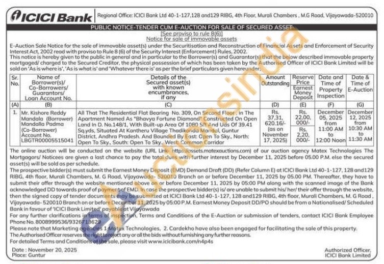 All That The Residential Flat Bearing No. 309, On Second Floor, In The Apartment Named As "Bhavya Fortune Diamond Constructed On Open Land in D. No.148/1, With Built-up Area Of 1080 Sft And Uds Of 39.41 Sq.yds, Situated At Kantheru Village Thadikonda Mandal, Guntur District, Andhra Pradesh. And Bounded By East: Open To Sky, North: Open To Sky, South: Open To Sky. West: Common Corridor