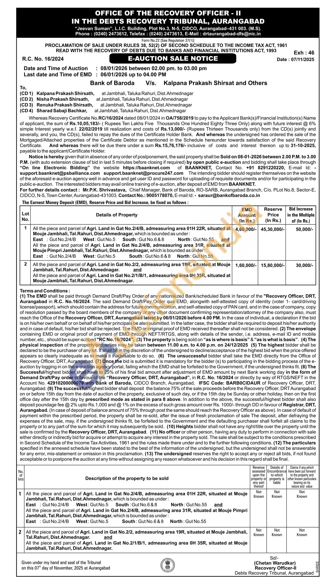 All the piece and parcel of Agri. Land in Gat No.2/2, admeasuring area 109R, situated at Mouje Jambhali, Tal Rahuri, Dist. Ahmednagar. All the piece and parcel of Agri. Land in Gat No.2/1/B/1, admeasuring area OH 35R, situated at Mouje Jambhali, Tal. Rahuri, Dist. Ahmednagar.