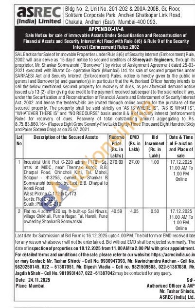 Industrial Unit Plot C-220 admn 11781 Sq. Thermax Kondi, B.BJ mtrs at MIDC, near Ther Dhamal Road, Chincholi Kati, Tal Mohol, Solapur 413255, owned by Shankar B Somwanshi bounded by: East: B.B. Dharpal to Kondi Road West: Platno.C-172 10 C-173 North: Plot C-221 South: Plat no.C-219