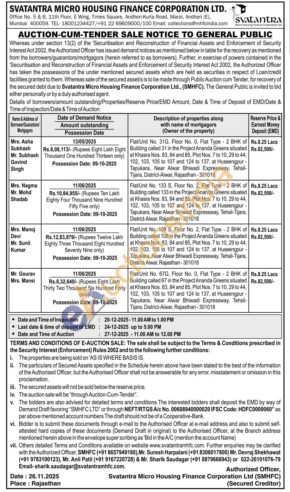 Authorized Officer, SMHFC (+918657949180), Mr. Suresh Harpalani (+918306017800) Mr. Devraj Shekhawat (+91 9783100123), Mr. Anil Patil (+91 9167220728) & Mr. Sharik Saudagar (+91 8879666943) or 022-26101076-79