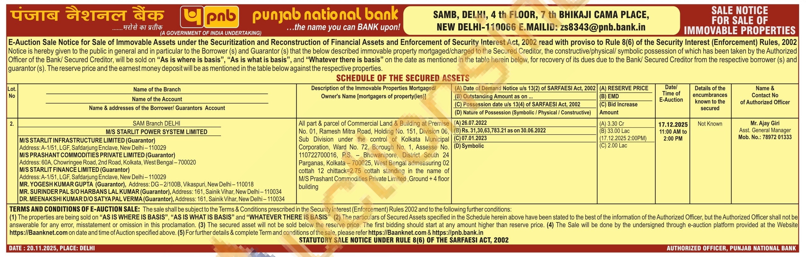All part & parcel of Commercial Land & Building at Premise No. 01. Ramesh Mira Road, Holding No. 151. Division 06. Sub Division under the control of Kolkata Municipal Corporation, Ward No. 72. Borough No. 1, Assasan No. 110722700016, P.S. Bhowanipore, District South 24 Parganas, Kolkata-700025, West Bengal admeasuring 02 cottan 12 chittack 2.75 cottah standing in the name of MIS Prashant Commodities Private Limited, Ground + 4 floor building