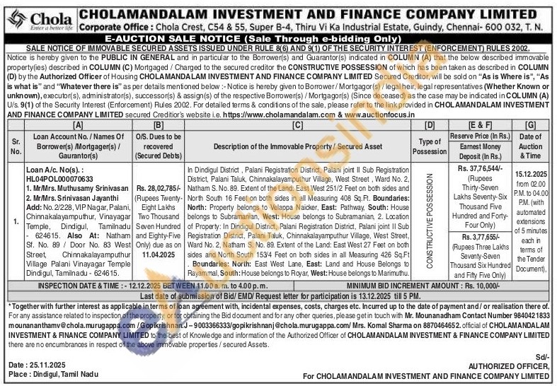 In Dindigul District, Palani Registration District, Palani joint II Sub Registration District, Palani Taluk, Chinnakalayamputhur Village, West Street, Ward No. 2, Natham S. No. 89. Extent of the Land: East West 251/2 Feet on both sides and North South 16 Feet on both sides in all Measuring 408 Sq. Ft. Boundaries: North: Property belongs to Velappa Naicker, East: Pathway, South: House belongs to Subramanian, West: House belongs to Subramanian, 2. Location of Property: In Dindigul District, Palani Registration District, Palani joint II Sub Registration District, Palani Taluk, Chinnakalayamputhur Village, West Street, Ward No. 2, Natham S. No. 89. Extent of the Land: East West 27 Feet on both sides and North South 1534 Feet on both sides in all Measuring 426 Sq.Ft Boundaries: North: East West Lane, East: Land and House Belongs to Rayammal, South: House belongs to Royar, West: House belongs to Marimuthu