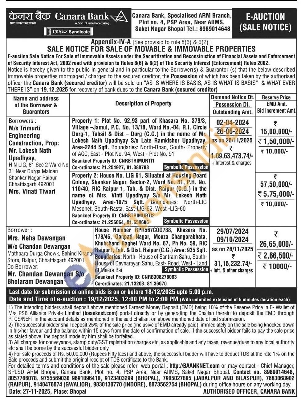 Property 1: Plot No. 92,93 part of Khasara No. 379/3, Village -Jamul, P.C. No. 13/18, Ward No.-04, R.I. Circle Durg-1, Tahsil & Dist Durg (C.G.) in the name of Mr. Lokesh Nath Upadhyay S/o Late Ramkishor Upadhyay. Area-2244 Sqft. Boundaries: North-Road, South- Property of ACC, East Plot No. 94, West - Plot No. 91 Baanknet Property ID: CNRBTRIMURTI1 Co-ordinates: 21.254927, 81.380798