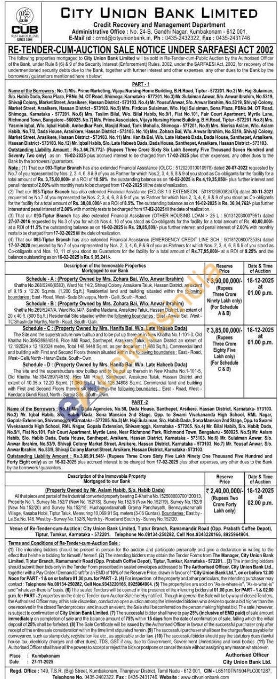 Khatha No 268/5246(6583), Ward No. 14/2, Shivaji Colony, Arasikere Taluk, Hassan District, an extent of 9.15 x 12.20 Sq.mts. (1,200 Sq.ft.) Residential land and building situated within the following boundaries: East-Road, West-Sada Shivappa, North-Galli, South-Road, Schedule B: (Property Owned by Mrs. Zohara Bai, W/o, Anwar Ibrahim) Khatha No. 269/5247/A, Ward No. 14/7, Santhe Maidana, Arasikere Taluk, Hassan District, an extent of 20 x 40 ft. (800 Sq.ft.) Residential Site situated within the following boundaries: East-Anwar Set, West-TC Shashidar Murthy, North-Road, South-Galli
