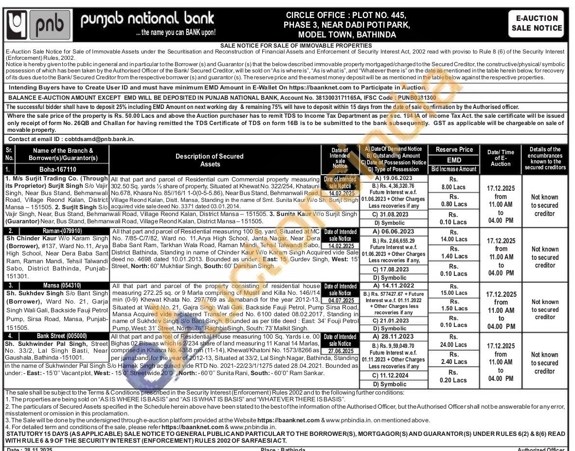 All that part and parcel of Residential cum Commercial property measuring Vajir 302.50 Sq. yards ½ share of property, Situated at Khewat No. 322/254, Khatauni No.678, Khasra No. 85//16/1 1-0(0-5-5.86), Near Bus Stand, Behmanwali Road, Village Reond Kalan, Distt. Mansa, Standing in the name of Smt. Sunita Kaur W/o Sh. Surijt Singh S/o acquired vide sale deed No. 3371 dated 03.01.2014.