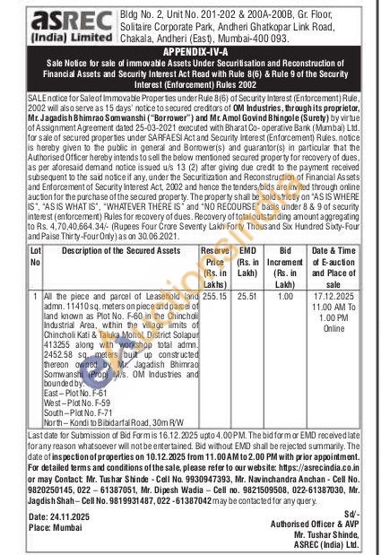 All the piece and parcel of Leasehold land admn. 11410sq. meters on piece and parcel of land known as Plot No. F-60 in the Chinchol Industrial Area, within the village limits of Chincholi Kati & Taluka Mohol, District Solapur 413255 along with workshop total admn. 2452.58 sq. meters built up constructed Thereon owned by Mr. Jagadish Bhimrao Somwanshi (Prop) Mis. OM Industries