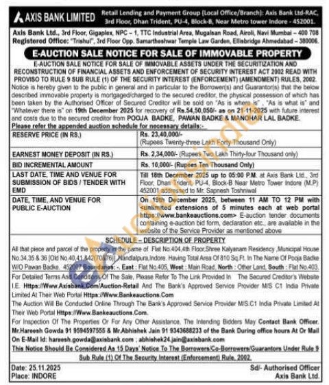 All that piece and parcel of the property in the name of Flat No.404,4th Floor, Shree Kalyanam Residency, Municipal House No.34.35 & 36 [Old No.40,41,842(70876) Nandlalpura, Indore. Having Total Area Of 810 Sq Ft. In The Name Of Pooja Badke WID Pawan Badke 452007 Boundaries: East: Flat No 405, West: Main Road North: Other Land, South: Flat No.403