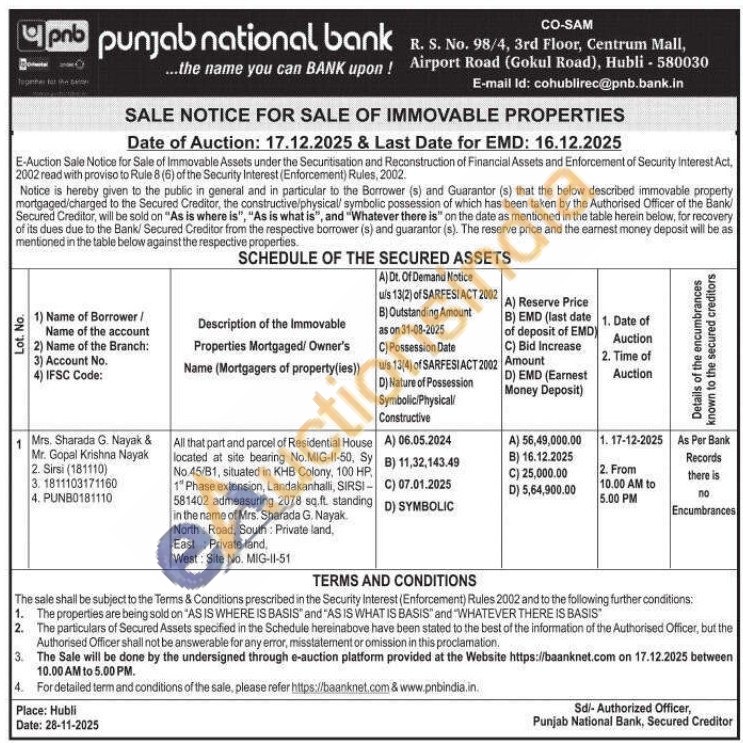 All that part and parcel of Residential House located at site bearing No.MIG-11-50, Sy No. 45/B1, situated in KHB Colony, 100 HP, 1" Phase extension, Landakanhalli, SIRSI-581402 admeasuring 2078 sq.ft. standing in the name of Mrs. Sharada G. Nayak North Road, South: Private land, East Private land. West: Site No. MIG-II-51