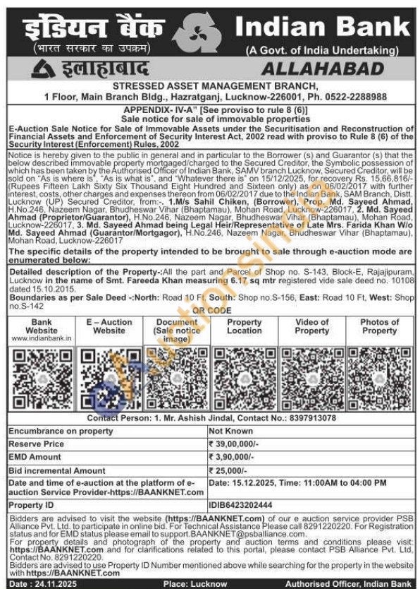 Detailed description of the Property-:All the part and Parcel of Shop no. S-143, Block-E, Rajajipuram, Lucknow in the name of Smt. Fareeda Khan measuring 6.17 sq mtr registered vide sale deed no. 10108 dated 15.10.2015.Boundaries as per Sale Deed-North: Road 10 Ft, South: Shop no.S-156, East: Road 10 Ft, West: Shop no.S-142