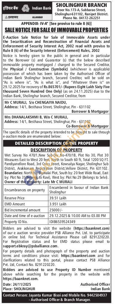 Wet Survey No 470/1, New Sub-Div No-470/1B, Plot No 30, Plot 30 Measures East to West 20 feet, North to South 60 ft, Total 1200 SQ FT. Pandiyanellore Road, 3rd Cross street, Kowsalya Nagar, Sholinghur Sub District, Arakkonam Registration District, Vellore District, Pin 631102. Boundaries: North by: Elumalai Plot, South by: 20 feet Wide Road, East by: Plot No 31(Belongs to Ravi), West by: Plot No:29 (Belongs to Selvi). Owner of the property: Late Mr C MURALI