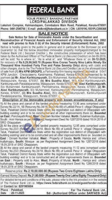 1) All the piece and parcel of the landed property measuring 13.36 ares comprised under Survey No.22/1A, 1B (Resurvey No. 34/18. Block No 89) of Lekkidi Perur Il village Ottappalam Taluk, Palakkad District Kerala State within the registration sub district of Oftappalam with building existing and or to be constructed and all other improvements there on. Bounded on East: Panchayath Road, West: Randam Number Vahakal, North: Sulaiman Kudiyiruppu, South Amir Haraza as per Registered Assignment Deed No 1287/2018 dated 18.04.2018 of SRO Ottappalam,2) All the piece and parcel of the landed property measuring 12.95 ares comprised under Survey No 23/3 (Resurvey No.34/18, Block No 89) of Lekkidi Perur village Ottappalam Taluk, Palakkad District Kerala State within the registration sub district of Oftappalam with building existing and or to be constructed and all other improvements there on bounded on East: Onnam Number Vahakal, West: Property of Sauda, North: Hamza and others kudiyiruppu. South: Mosque as per Registered Assignment Deed No 1287/2018 dated 18.04.2018 of SRO Ottappalam.3) All the piece and parcel of the landed property measuring 11.12 ares comprised under Survey No.23/3 (Resurvey No.34/18, Block No 89) of Lekkidi Perur village Ottappalam Taluk, Palakkad District Kerala State within the registration sub district of Ottappalam with building existing and or to be constructed and all other improvements there on. Bounded on East: Property sold to Alavi. West: Property of Murali. North: Hamza and others kudiyinuppu, South Mosque as per Registered Assignment Deed No 1288/2018 dated 18.04.2018 of SRO Ottappalam.