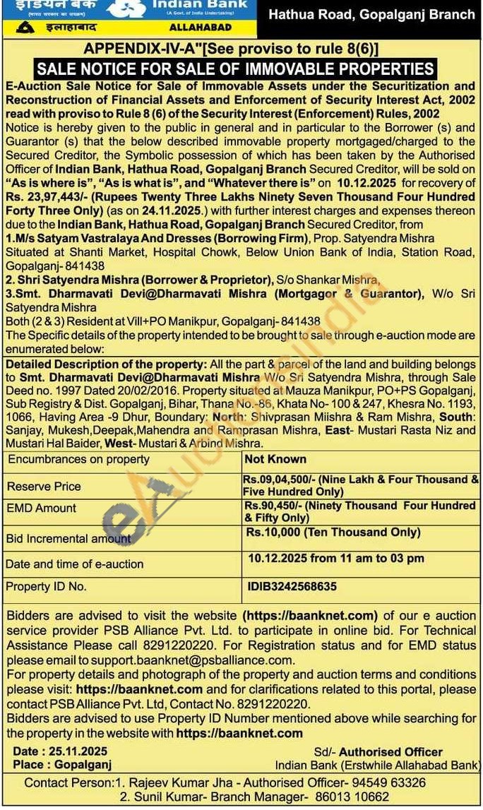 Detailed Description of the property: All the part & parcel of the land and building belongs to Smt. Dharmavati Devi@Dharmavati Mishra W/o Sri Satyendra Mishra, through Sale Deed no. 1997 Dated 20/02/2016. Property situated at Mauza Manikpur, PO+PS Gopalganj, Sub Registry & Dist. Gopalganj, Bihar, Thana No.-86, Khata No-100 & 247, Khesra No. 1193, 1066, Having Area -9 Dhur, Boundary: North: Shivprasan Miishra & Ram Mishra, South: Sanjay, Mukesh, Deepak, Mahendra and Ramprasan Mishra, East- Mustari Rasta Niz and Mustari Hal Baider, West- Mustari & Arbind Mishra