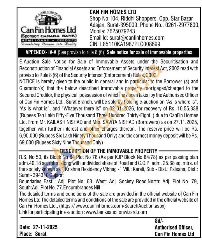 R.S. No 50, its Block No 84 Plot No 78 (As per KJP Block No 84/78) as per passing plan adm.40.18 sq. mtrs. along with undivided share of Road and C.O.P adm. 25.68 sq. mtrs. of the society known as "Krishna Residency Vibhag -1 Vill.: Kareli, Sub - Dist.: Palsana, Dist.: Surat-394310 Gujarat