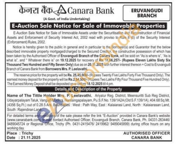 Ariyalur Reg. District, Meensuritti Sub Reg District, Udayarpalayam Taluk, Vangudi Madhra, Narasingapalayam, Pu. S.F.No. 139/1A2A(Old S.F.139/1A), 404.68 Sq. Mt. (4356 Sq.Ft.) out of 0.28.5 Ars. Boundaries: West: Path Way, East: Kalaiarasi Land, North: Kalaiarasan Land, South: Rajendiran Land.