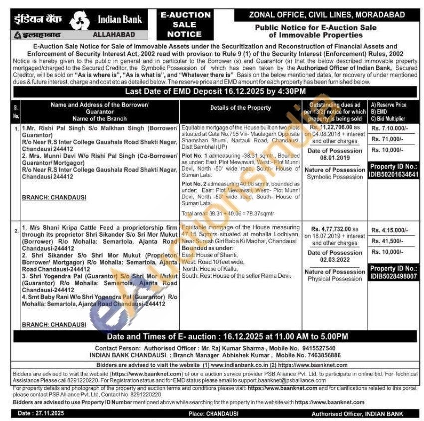 Equitable mortgage of the House built on two plots situated at Gata No.795 Viii- Maulagarh Opposite Shamshan Bhumi, Nartauli Road, Chandausi, Distt Sambhal (UP) Plot No. 1 admeasuring -38.31 sqmtr., Bounded as under: East: Plot Mewawati, West:- Plot Munni Devi, North 50' wide road, South House of Suman Lata Plot No. 2 admeasuring 40.06 sqmtr, bounded as under. East: Plot Mewawati, West:- Plot Munni Devi, North -50 wide road, South- House of Suman Lata