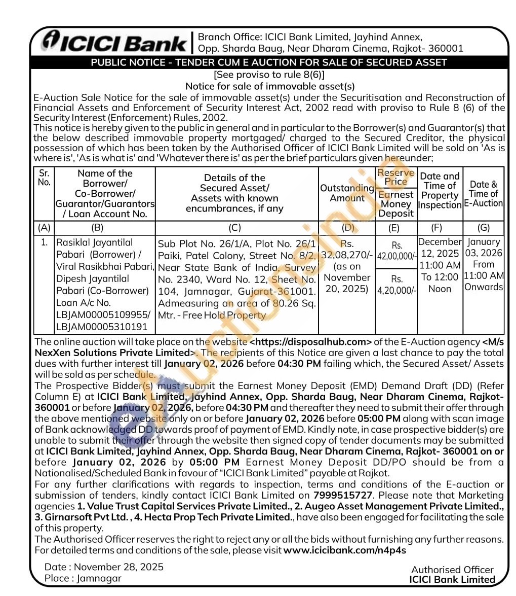 Sub Plot No. 26/1/A, Plot No. 26/1 Paiki, Patel Colony, Street No. 8/2, Near State Bank of India, Survey No. 2340, Ward No. 12, Sheet No. Admeasuring an area of 80.26 Sq. 104, Jamnagar, Gujarat-361001. Mtr. - Free Hold Property