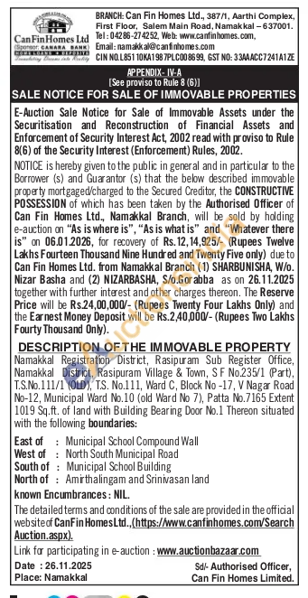 Namakkal Registration District, Rasipuram Sub Register Office, Namakkal District, Rasipuram Village & Town, SF No.235/1 (Part), T.S.No. 111/1 (OLD), T.S. No.111, Ward C, Block No -17, V Nagar Road No-12, Municipal Ward No.10 (old Ward No 7), Patta No.7165 Extent 1019 Sq.ft. of land with Building Bearing Door No.1 Thereon situated with the following boundaries: East of : Municipal School Compound Wall West of North South Municipal Road South of Municipal School Building North of Amirthalingam and Srinivasan land