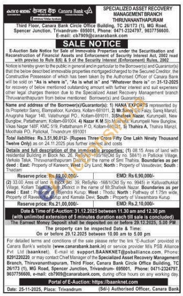 Details and full description of the immovable properties: (1) 08.15 Ares of land with residential Building in Block No. 26. ReSyNo-185/16 Old Sy no. 584/1) in Palickai Village. Varkala Taluk, Thiruvananthapuram District in the name of Smi Thahira. Boundaries as per deed: East: Property of Kareem, West: Dry Land, North: Property of Vasudevar, South Thadam