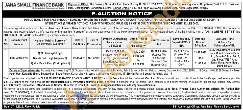 Details of Secured Assets; Property Area Measuring 71.66 Sq.yards situated at Krishna Basti, Malkana, Tehsil Samana, District Patiala, bearing Document No.2022-23/78/1/119 Dated 18.04.2022 Owned by Beant Kaur, W/o. Karamjit Singh. Bounded as: East: Puneet Kumar side 43, West: Constructed House side 43', North: Rasta, South: Nishu Bala side 15'