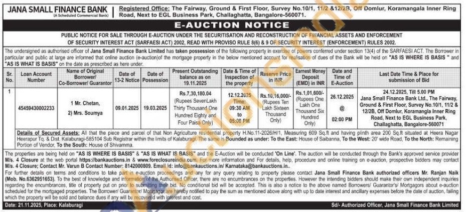 Details of Secured Assets: All that the piece and parcel of that Non Agriculture residential property H.No.11-2026/H/1, Measuring 609 Sq.ft and having plinth area 200 Sq.ft situated at Heera Nagar Heerapur Tq. & Dist. Kalaburagi-585104 Sub Registrar within the limits of Kalaburagi. The same is Bounded as under: To the East: House of Saibanna, To the West: 20' wide Road, To the North: Remaining Portion of Vendor, To the South: House of Shivamma.