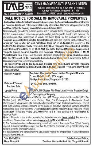 Tamilnad Mercantile Bank Limited Tirupathi Branch D. No. 19-4-121-14D, STV Nagar, Air Bye Pass Road, Tirupathi-517501
