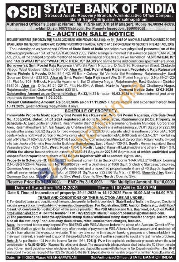 Schedule- A: East Godavari District, Rajahmundry District Registry, Rajamahendravaram Municipal Corporation Area, Rajamahendravaram, Sai Nagar, Sai Chaitanya Nagar, house site admeasuring 2659.81 Sq. yds or 2223.86 sq.mts after giving 568.52 Sq. yds for road widening out of 3228.33 Sq.yds site which is northern portion of Ac. 1-20 cents which is northwest portion of Ac.5-42 cents which is northern portion of Ac. 8-90 cents in R.S.No.371 now falling part of R.SNo.371/2A1, B.A.No. 769/2011-G1 approved by Commissioner, Municipal Corporation, Rajahmundry, divided into two blocks of Harivillu Residential Building Boundaries: East: Road-130-0 ft. South: Remaining site of BorraVasundara Devi-183-1½ ft., West: Road-130-0 ft, North: Land of Kanum illi Lakshmidevi and others-185-15 Within the above boundaries an extent of 2659.81 Sq.yds or 2223.86 Sq.mts out of which undivided and unspecified proportionate share of 43 Sq.yds together with all easement rights, etc.,Property in Schedule- B: Flat No.303 northwest comer flat in Second Floor in "HARIVILLU" B-Block, bearing D.No.89-21-22/44 (Assessment No. 1064065782), with a plinth area of 1060 Sq. ft (including Staircase, balconies, Common Area and car parking area). An undivided and unspecified proportionate share of 43 Sq.yds, together with all easementary nights, etc., out of 2659.81 Sq. Yds or 2223.86 Sq. Mts, (2 BHK), Bounded by: East: Common Corridor, South: Open to Sky, West: Open to Sky, North: Open to Sky,