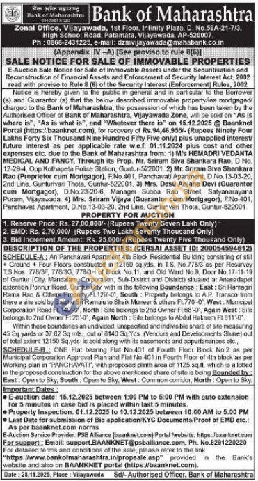 SCHEDULE-A; An Panchavati Apartment 4th Block Residential Building consisting of still Ground Four Floors constructed in 12150 sq yds in 15. No. 778/3 as per Resurvey TS.Nos. 778/3, 778/30, 778/3H of Block No.11, and Old Ward No. Door No 17-11-19 of Guntur (City, Mandalam, Corporation, Sub-District and District) situated at Ananadapet extention Ponnur Road, Guntur City, with in the following Boundaries. East: Sri Ramagiri Rama Rae & Others Property Ft. 129-0, South Property belongs to AP. Transco from there a site sold by Batchu Sri Ramulu to Shaik Muneer & others Ft.770-0 West: Municipal Corporation Road Fl. 140-0, North: Site belongs to 2nd Owner F168-0, Again West: Sile belongs to 2nd Owner F125-0, Again North: Site belongs to Abdul Hakeem PL811-0". Within these boundares an undivided, unspecified and indivisible share of site measuring 45 5q yards or 37 62 Sq mls out of 8140 Sq. Yds (Vendors and Developments Share) out of total extant 12150 Sq. yds is sold along with its easements and appurtenances etc., SCHEDULEB ONE Flat bearing Flat No. 401 of Fourth Floor Block No.2 as per Municipal Corporation Approval Plan and Flal No 401 in Fourth Floor of 4th block as per Working plan in "PANCHAVATI", with proposed plinth area of 1125 sq ft which is allotted in the proposed construction for the above mentioned share of site is being Bounded by: East: Open to Sky, South: Open to Sky, West: Common corridor, North: Open to Sky
