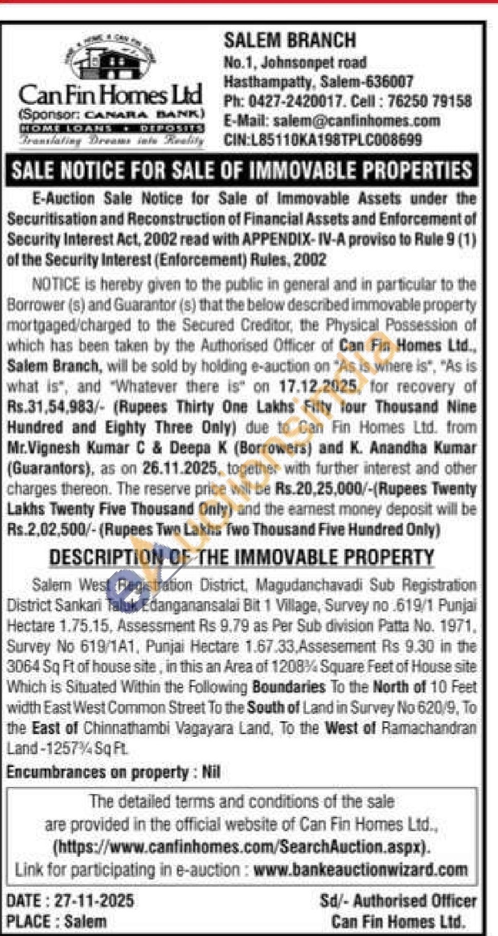 Salem West Registration District, Magudanchavadi Sub Registration District Sankari Taluk Edanganansalai Bit 1 Village, Survey no.619/1 Punjai Hectare 1.75.15, Assessment Rs 9.79 as Per Sub division Patta No. 1971, Survey No 619/1A1, Punjai Hectare 1.67.33, Assesement Rs 9.30 in the 3064 Sq Ft of house site, in this an Area of 1208% Square Feet of House site Which is Situated Within the Following Boundaries To the North of 10 Feet width East West Common Street To the South of Land in Survey No 620/9, To the East of Chinnathambi Vagayara Land, To the West of Ramachandran Land-1257% Sq Ft.