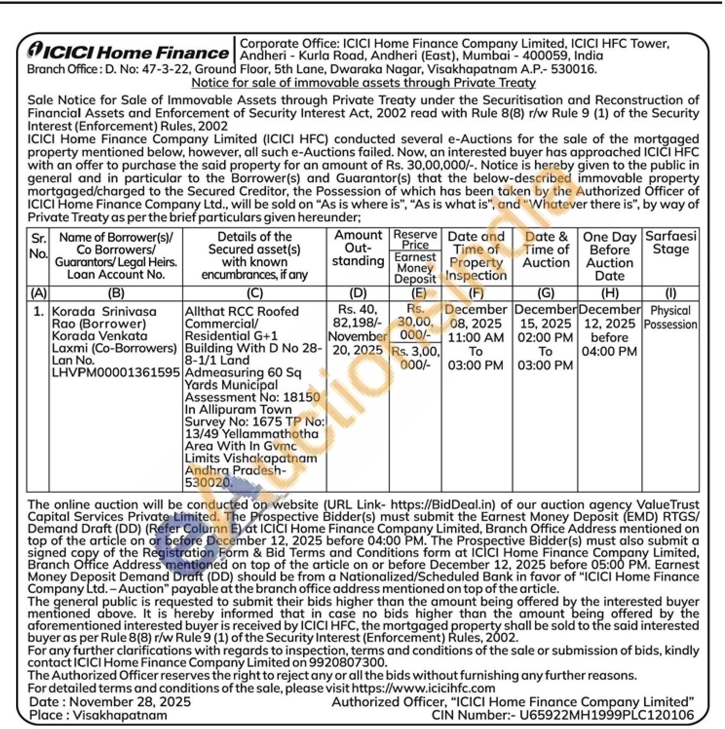 Allthat RCC Roofed Commercial/Residential G+1 Building With D No 28-8-1/1 Land Admeasuring 60 Sq Yards Municipal Assessment No: 18150 In Allipuram Town Survey No: 1675 TP No: 13/49 Yellammathotha Area With In Gvmc Limits Vishakapatnam Andhra Pradesh-530020.