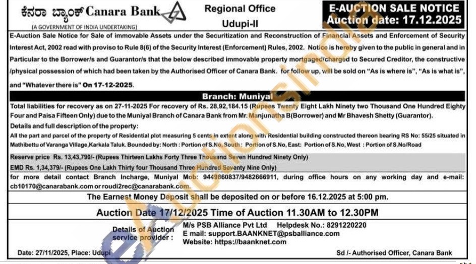 Details and full description of the property: All the part and parcel of the property of Residential plot measuring 5 cents in extent along with Residential building constructed thereon bearing RS No: 55/25 situated in Mathibettu of Varanga Village, Karkala Taluk. Bounded by: North: Portion of S. No, South: Portion of S. No, East: Portion of S. No, West: Portion of S. No/Road