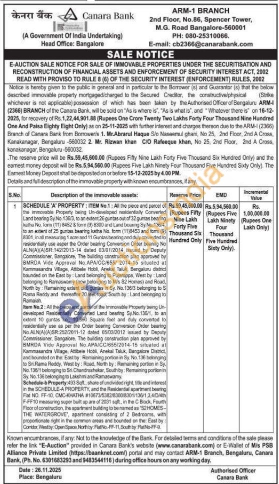 SCHEDULE 'A' PROPERTY: ITEM No.1: All the piece and parcel of the immovable Property being Un-developed residentially Converted Land bearing Sy. No. 136/3, to an extent 26 guntas out of 32 guntas bearing katha No. form (11) 8452 & form (9) 8300 and Land bearing Sy.No, 136/4, to an extent of 25 guntas bearing katha No. form (11)8453 and form (9) 8301, in all measuring 1 acre and 11 Guntas bearing and duly converted to residentially use asper the Order bearing Conversion Order bearing No ALN(A)(A)SR:142/2013-14 dated 03/01/2014 issued by Deputy Commissioner, Bangalore, The building construction plan approved by BMRDA Vide Approval No.APA/CC/655/ 2014-15 situated at Kammasandra Village, Attibele Hobli, Anekal Taluk, Bengaluru district bounded on the East by: Land belonging to Pujarappa, West by: Land belonging to Ramaswamy (now belonging to Mis S2 Homes) and Road, North by: Remaining extent of 6 guntas in Sy. No.136/3 belonging to S Rama Reddy and thereafter 20 feet road, South by: Land belonging to Ramaiah.