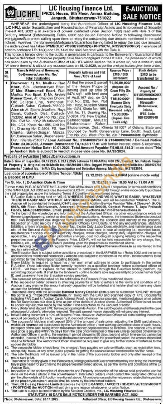 All that the piece & parcel of the House Property W/o-having Built up area of 5474 sqft., with land area of Ac.0.107 dec. on GA Plot No.: 232, Rev. Plot No.: 1052, Mutation Khata No.: 2/24, Khata No.: 985. Unit No. 11, Drawing No. C-3204, PS: New Capital Saheednagar, Mouza: Bhubaneswar Sahar, Bhubaneswar, Dist. Khurda-751007 of Odisha State and Bounded by- North: Conservancy Lane, South: Road, East: Plot No. 233, West: Plot No. 231/Possession