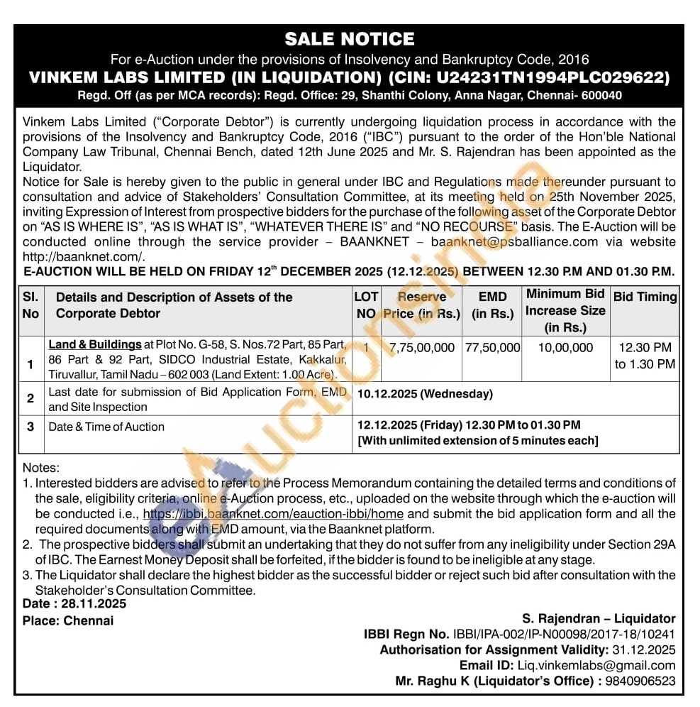 Land & Buildings at Plot No. G-58, S. Nos. 72 Part, 85 Part, 86 Part & 92 Part, SIDCO Industrial Estate, Kakkalur, Tiruvallur, Tamil Nadu-602 003 (Land Extent: 1.00 Acre