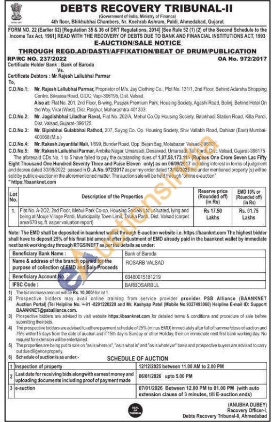 Flat No. A-202, 2nd Floor, Mehul Park Co-op. Housing Society Ltd, situated, lying and being at Mouje Village Pardi, Municipality Town Linil, Taluka Pardi, Dist. Valsad (carpet area 670 sq ft as per valuation report)