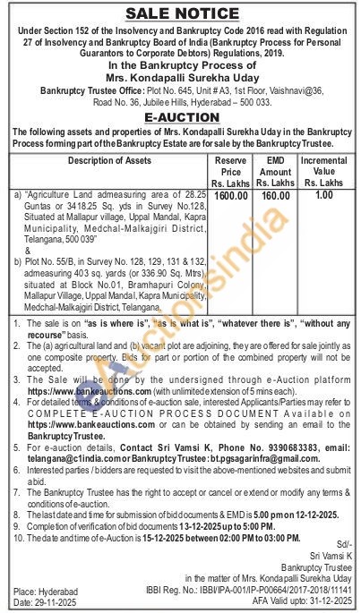 a) Agriculture Land admeasuring area of 28.25 Guntas or 34 18.25 Sq. yds in Survey No.128, Situated at Mallapur village, Uppal Mandal, Kapra Municipality, Medchal-Malkajgiri District, Telangana, 500 039" &