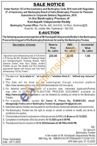 "Agriculture Land admeasuring area of 5.00 Acres in R Survey No.543, Situated at Pedavegi Village and Grampanchayath, Pedavegi Mandal, West Godavan District, Now Eluru District, Andhra Pradesh (as per Title Deeds) and RCC Building appurtenant thereto with Ground and First Roor admeasuring 1120 Sq. Fteach"