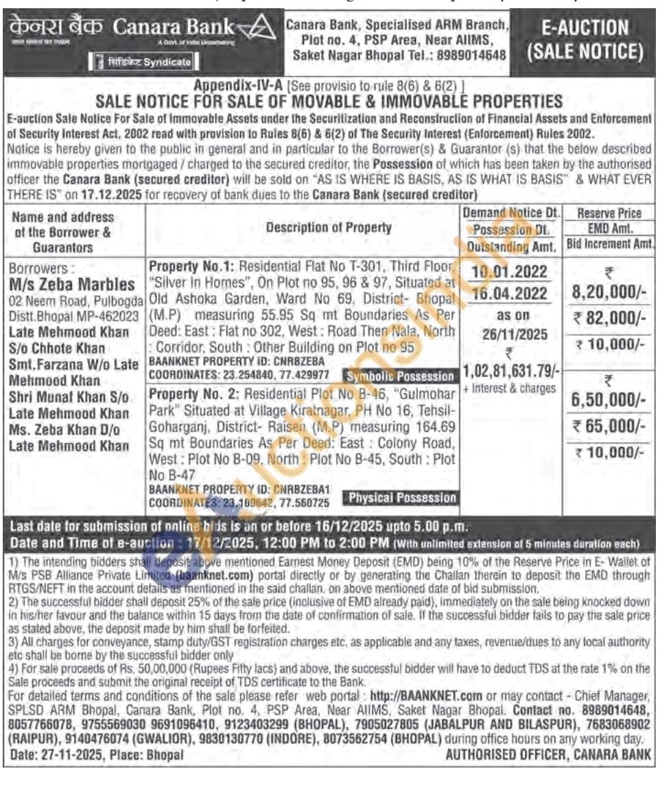 Residential Flat No T-301, Third Floor, "Silver In Hornes", On Plot no 95, 96 & 97, Situated at Old Ashoka Garden, Ward No 69, District- Bhopal (M.P) measuring 55.95 Sq mt Boundaries As Per Deed: East: Flat no 302, West Road Then Nala, North Corridor, South: Other Building on Plot no 95 BAANKNET PROPERTY ID: CNRBZEBA