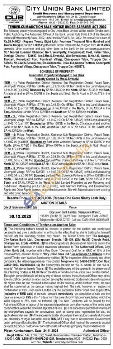ITEM-6 Palani Registration District, Keeranur Sub Registration Destrict, Palani Taluk Velampatti Vilage. RSF.No. 138/2E1. p.003.34 (Old SF No. 138/2E) in his Land Measuring ph.0.03.34 (pa 0.08 14) Bounded by East West Common Pathway in SF No. 138/28 in the North, C Nattuduras and Another Land in SF.No. 138/2E in the East, SFNo 1383A in the South and SF No. 137/20 in the West. In total Landed Properties as per Resurvey and Subdivision Measuring ph.121.44 (pa.3.00), with Mamool Pathway and Easementary Rights and Other Rights thereon, as per the documents. Site with Superstracture now existing and to be putup thereon.