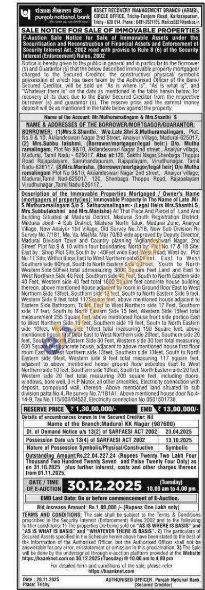 All That Piece And Parcel of Land And Building Situated at Madurai District, Madurai South Registration District, Madurai Joint- 4 Sub District, Madurai North Taluk, Madurai Zone, Analy Anaiyur Village, Now Anaiyur 1bit Village. Old Survey No. 7/18, Now Sub Division Re Survey No. 7/181, Ma. Va. Ma(Ma. Ma) 70/83 vide approved by Deputy Director, Madural Division Town and Country planning "Agilandeshwari Nagar, 2nd Street Plot No.9 & 10 10 within four four bour boundaries: North by: Plot No.17 & 18 Site: East by: Shop Plot Site: South by: 40Feet wide East-West Road, West by: Plot No:11 Site. Within these East to West Northern side6 OF eet, East to West Southern side 60Feet, South to North Eastern Side 50Feet, South to North Western Side 50 Feet total admeasuring 3000 Square Feet Land and East to West Northern Side 40 Feet, Southern side 40 Feet, South to North Eastern side 40 Feet, Western side 40 feet total 1600 Square feet concrete house building thereon, above mentioned house adjacent by room in Ground floor East to West Northern Side 13feet, Southern side 13 feet, South to North Eastern Side 9 feet, Western Side 9 feet total 117Square feet, above mentioned house adjacent to Eastern Side Bathroom, Toilet, East to West Northern side 17 Feet, Southern side 17 feet, South to North Eastern Side 15 feet, Western Side 15feet total measurement 255 Square feet, above mentioned house front side portico East to West Northern Side 19 feet, Southern side 19 feet, South to North Eastern side 10feet. Western side 10feet total measuring 190 Square feet, above mentioned house first floor East to West Northern side 20feet, Southern side 20 feet, South to North Eastern Side 30 Feet, Western side 30 Teet total measuring 600 Square feet concrete house, adjacent to above mentioned house first floor room East to West Northern side 13feet, Southern side 13leet, South to North Eastern side Steet, Western side 9 feet total measuring 117 square feet, adjacent to above mentioned house ground floor asbestos East to West Northern side 10 feet, Southern side 10feet, South to North Eastern side 20 feet, Western side 20 feet total measuring 200 square feet, including doors, windows, bore well, 3 H.P Motor, all other amenities, Electricity connection with deposit, compound wall, thereon. Above mentioned land situated in sub division patta No.4, Re survey No.7/181A1. Above mentioned house door No.4-14-9, Tax No. 115/003/04532, Electricity connection No. 0501501738
